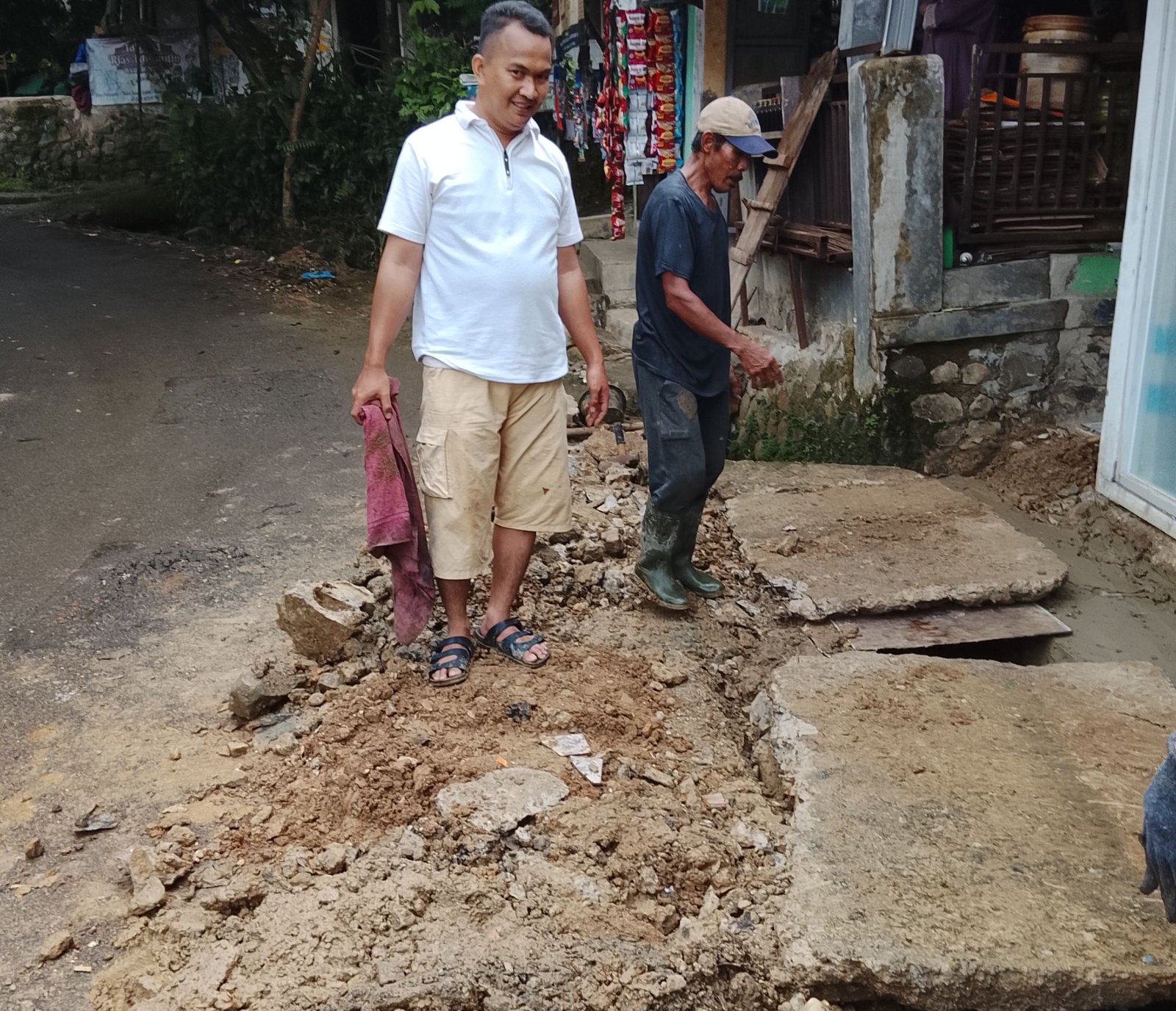 Menurut salah satu warga Haurbentes Pengkolan Desa Wirajaya Alan menuturkan, pembuangan air melewati drainase jalan kabupaten terjadi pendangkalan yang mengakibatkan pondasi warung dan praktek Bidan hanyut terbawa air di jalan Kabupaten.